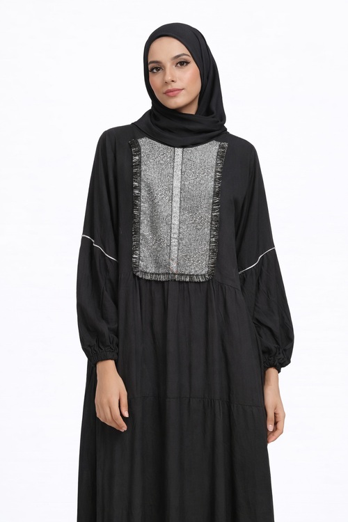 Steel Grey Satin Open Abaya with Fringe & Lace Trim -